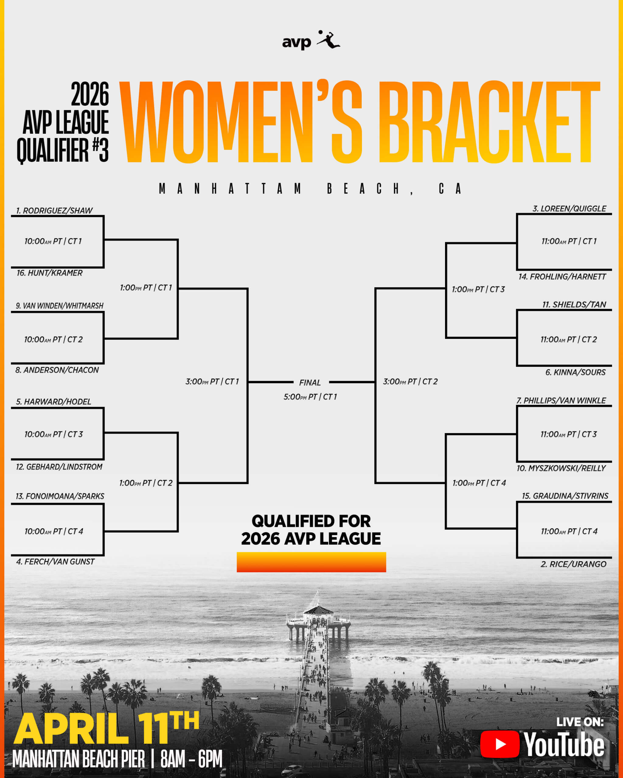 This third and final League qualifier event will feature 16 teams per gender in a single-elimination format. Matches will be best two-of-three to 15 points. Athletes already qualified for the 2026 League are not eligible to compete. Points from these events will not impact AVP player rankings. The winners (per gender) of this event earn an automatic birth into the 2026 AVP League Season which kicks off in Belmar, NJ May 30-31.
